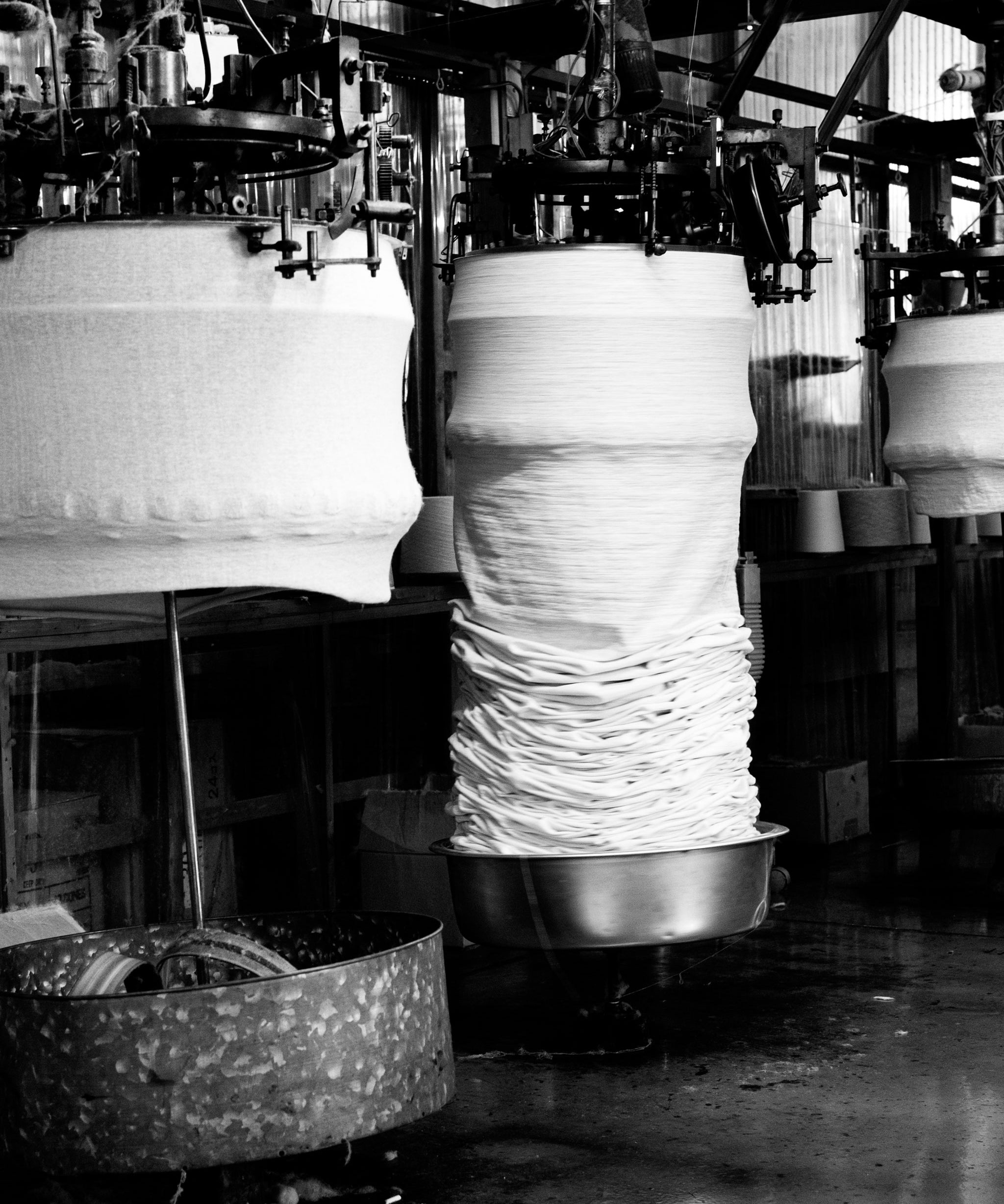 1960年頃までは活躍していたヨーロッパ生まれのこの編み機は、天井から吊り下げられた状態で生地を編んでいくため「吊り編み機」や「吊り機」と呼ばれる。糸に余計なテンションをかけず、ゆっくりと編んでいくため、空気を含んだように柔らかで、なおかつ丈夫な生地を編むことができる。しかし、1時間に1メートルほどしか編むことが出来ないため、大量生産・大量消費の社会の中で出番を失っていき、今では世界的にも日本の和歌山県の数社でしか稼働していない貴重な技術。