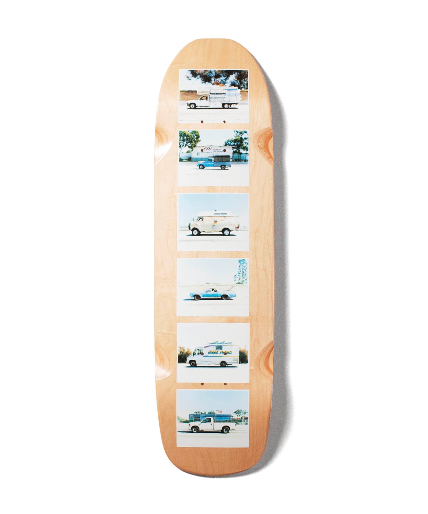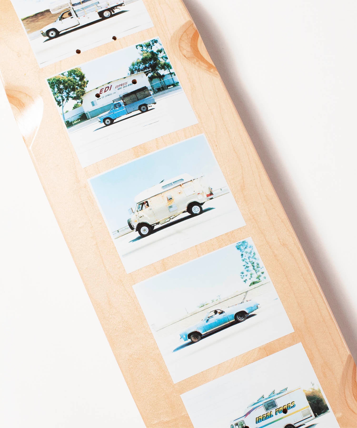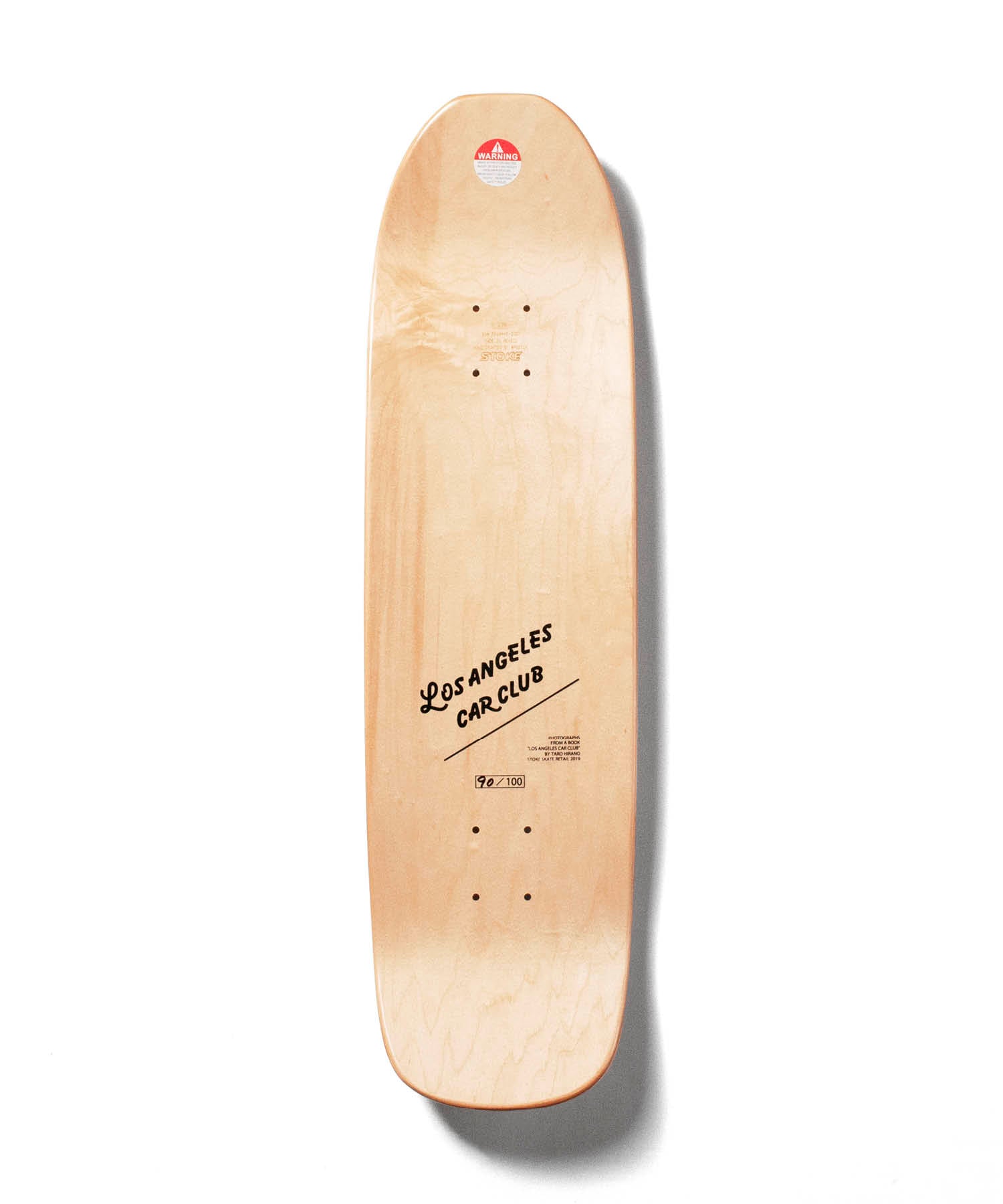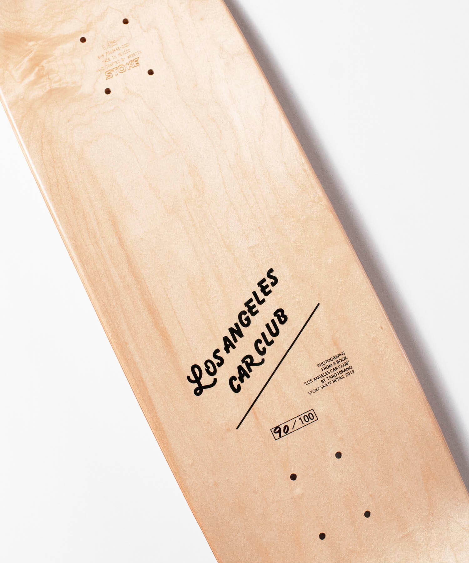 登戸にあるローカルスケートショップ"STOKE SKATE RETAIL"の100本限定オリジナルデッキ。写真家、平野太呂氏とのコラボデッキで、太呂氏の写真集『Los Angeles Car Club』より抜粋したカットをプリントした、8.625インチ(21.9センチ)の太くて厚めなプールシェイプ。底面にはウィールバイトを防ぐためのウィールウェルが彫られています。アメリカのビッグカンパニーも制作する工場で作られていてクオリティの面でも最高品質のデッキ。